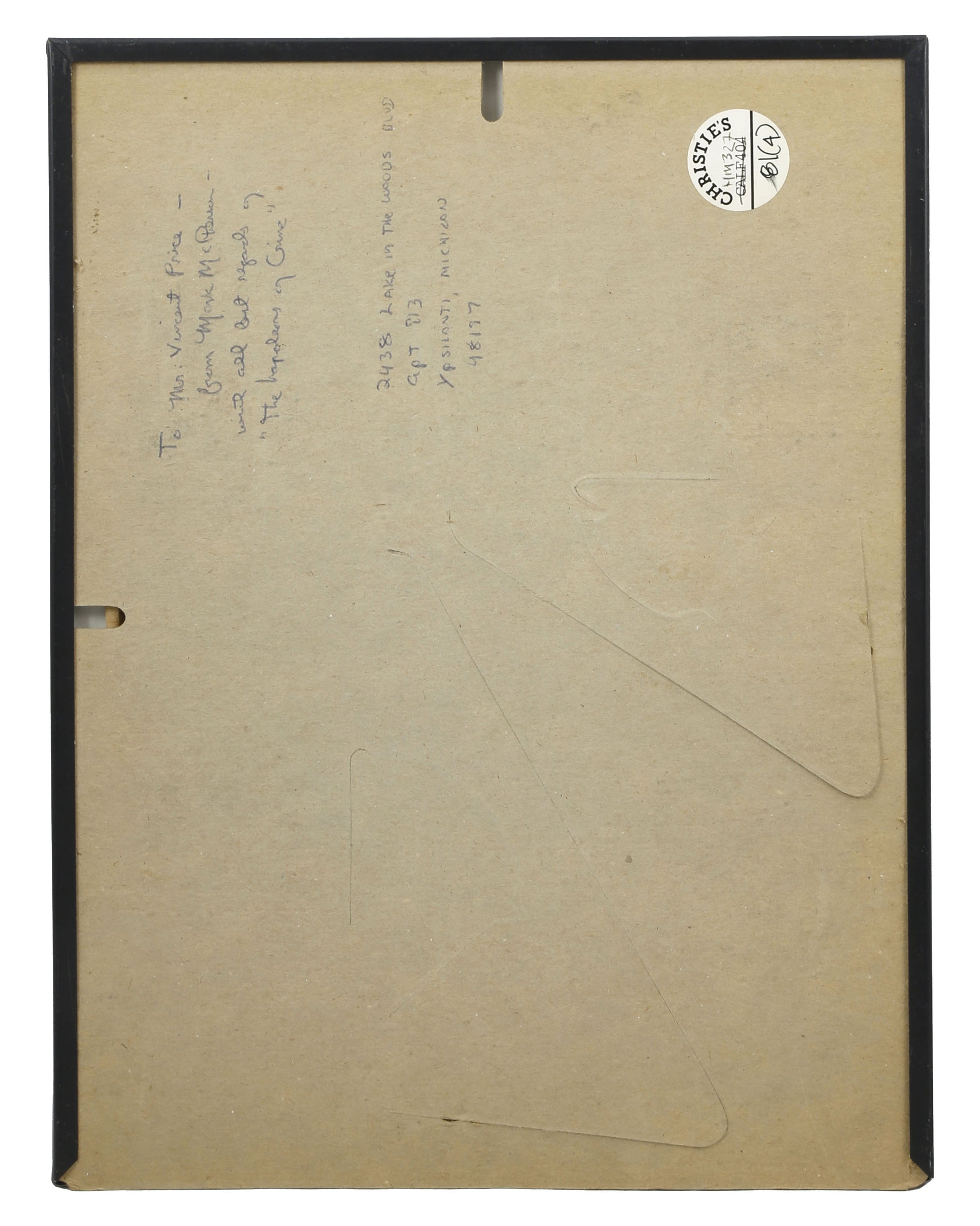 Award #1: The Napoleons of Crime Certificate (1977) presented to Vincent Price on September 16th, 1977, this rare award from the mysterious and elite society known as The Napoleons of Crime is a tribute to Price’s lifelong embodiment of villainy, darkness, and charismatic menace. The text honors his "constant and nefarious representation of villainous standards, as well as for his apt personification on film, stage, recording and print of the dark and eldritch powers which continually serve as a check upon the forces of good." Signed by Founder James Moriarty and Honorary Professor Mark McPherson. Features a wax seal adorned with a gold-leaf banner on the proper right side. Housed in a thin black plastic frame with gold interior trim. Includes a personal handwritten message on the reverse: “With all best regards / The Napoleons of Crime” - signed by Mark McPherson.