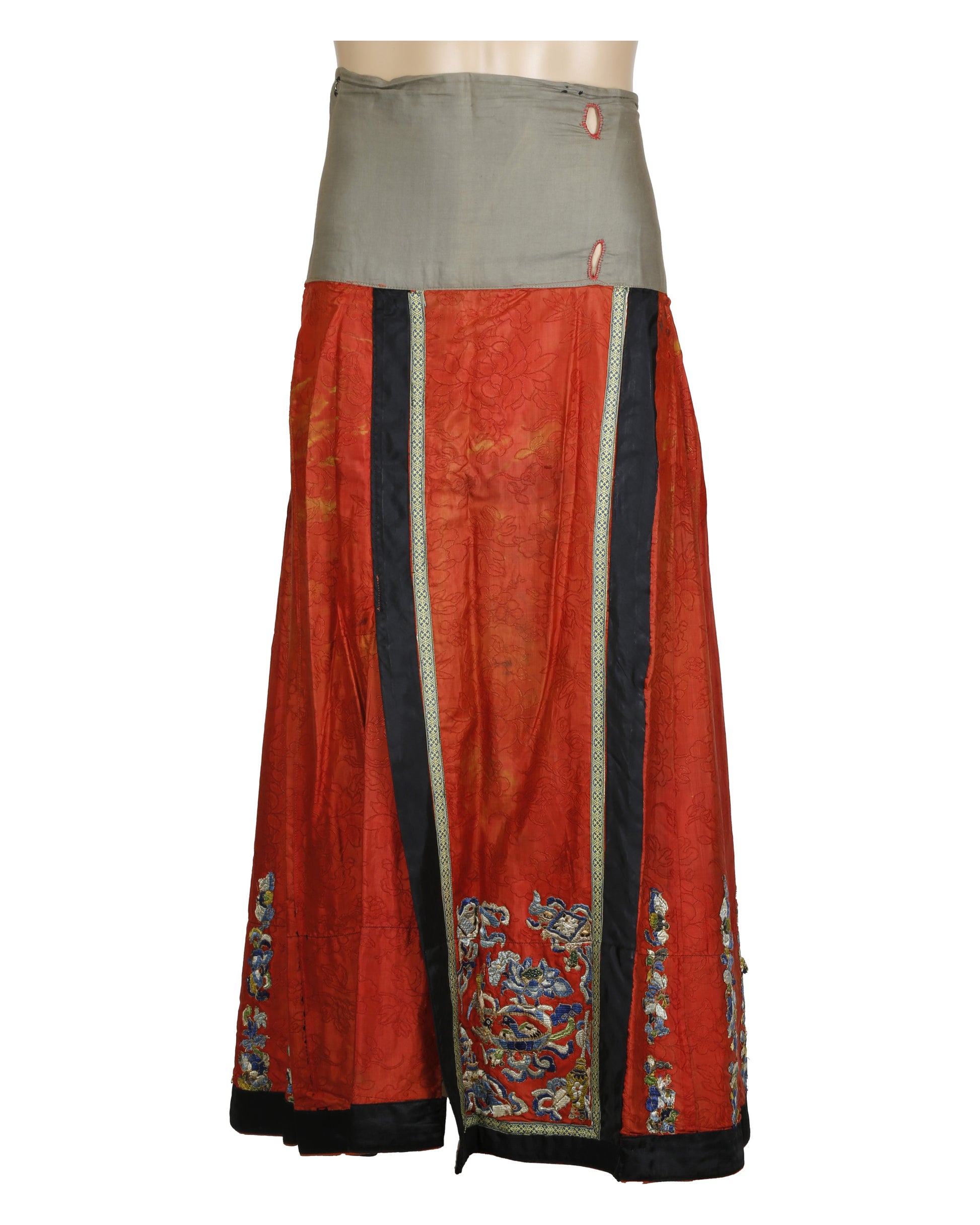 The matching orange silk skirt is pleated with blue embroidered floral designs applied at the bottom of each pleat and finished with black fabric along the hem. The skirt features a gray fabric waist, wraps around the body, and secures with hook-and-eye closures. The handwritten notation “NEIL” appears in blue ink at the top of the waist, likely referencing the assigned actor or production fitting.