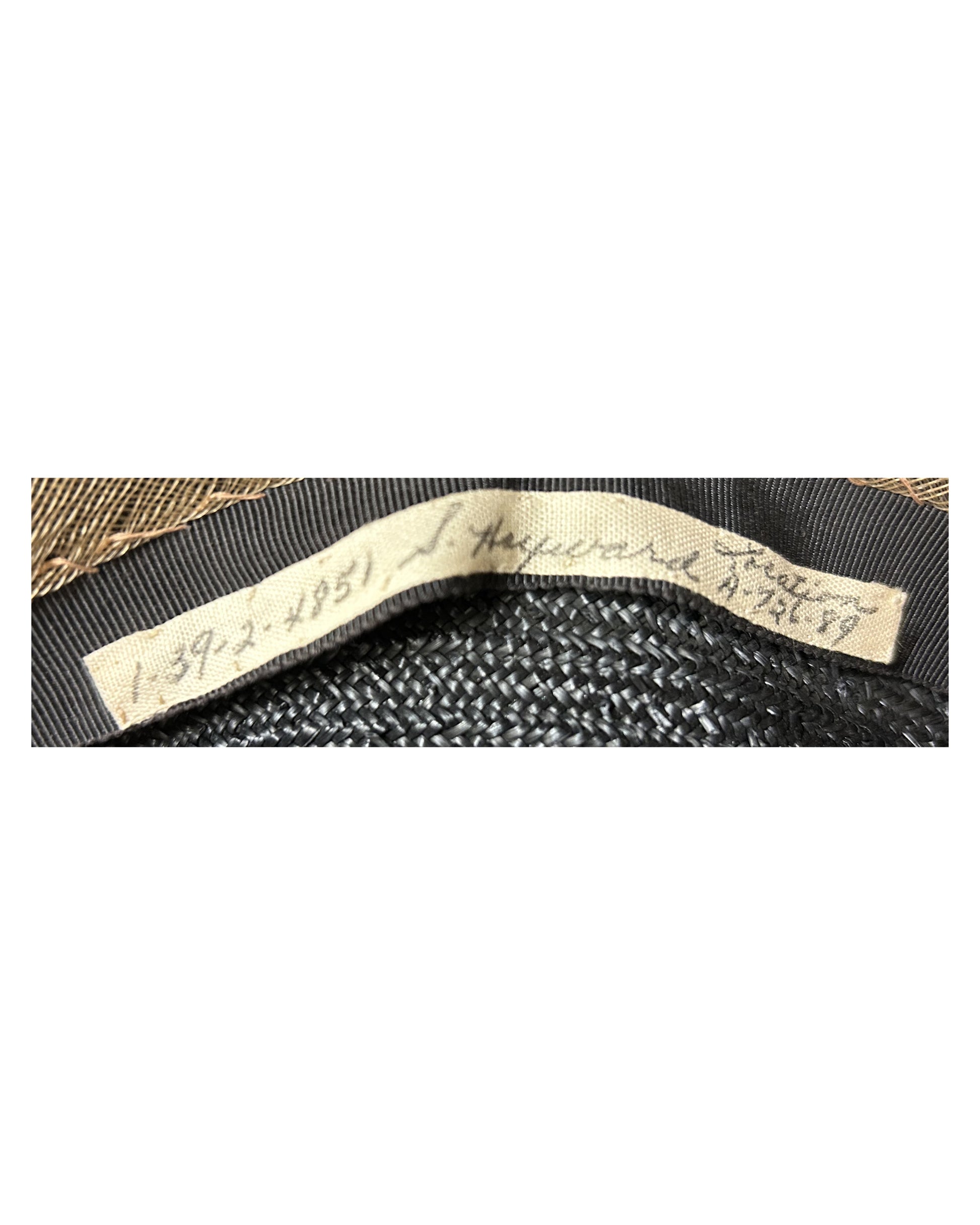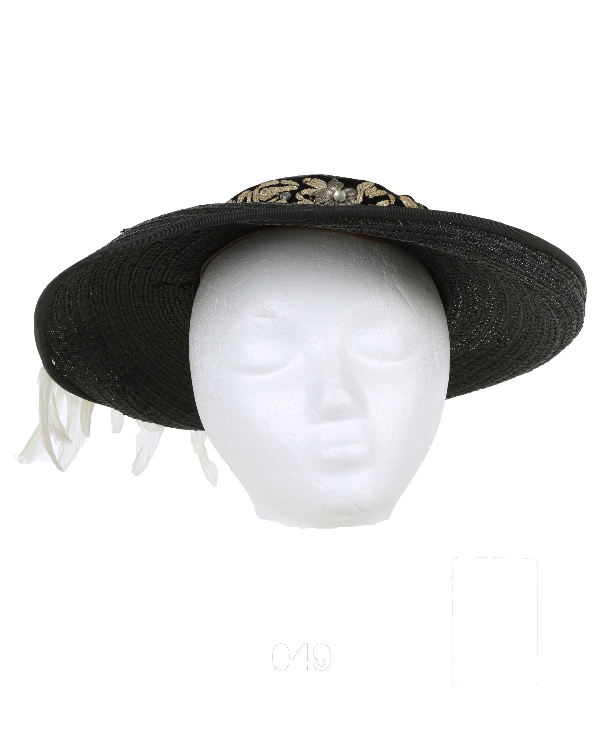 Black straw hat featuring a black felt band adorned with an intricate silver floral motif. Delicately placed white feathers add elegance and height to the overall silhouette. The interior bears a sewn-in tag with black text that reads: “1-39-4851 S. Hayward Location / A-726-89”