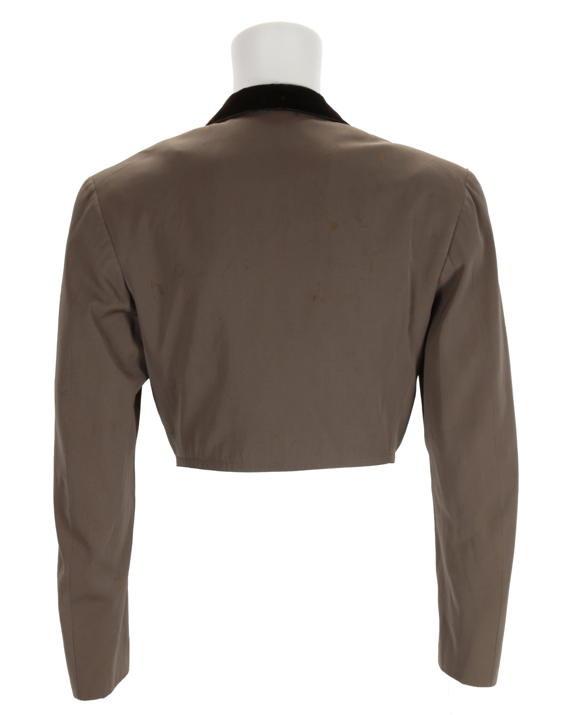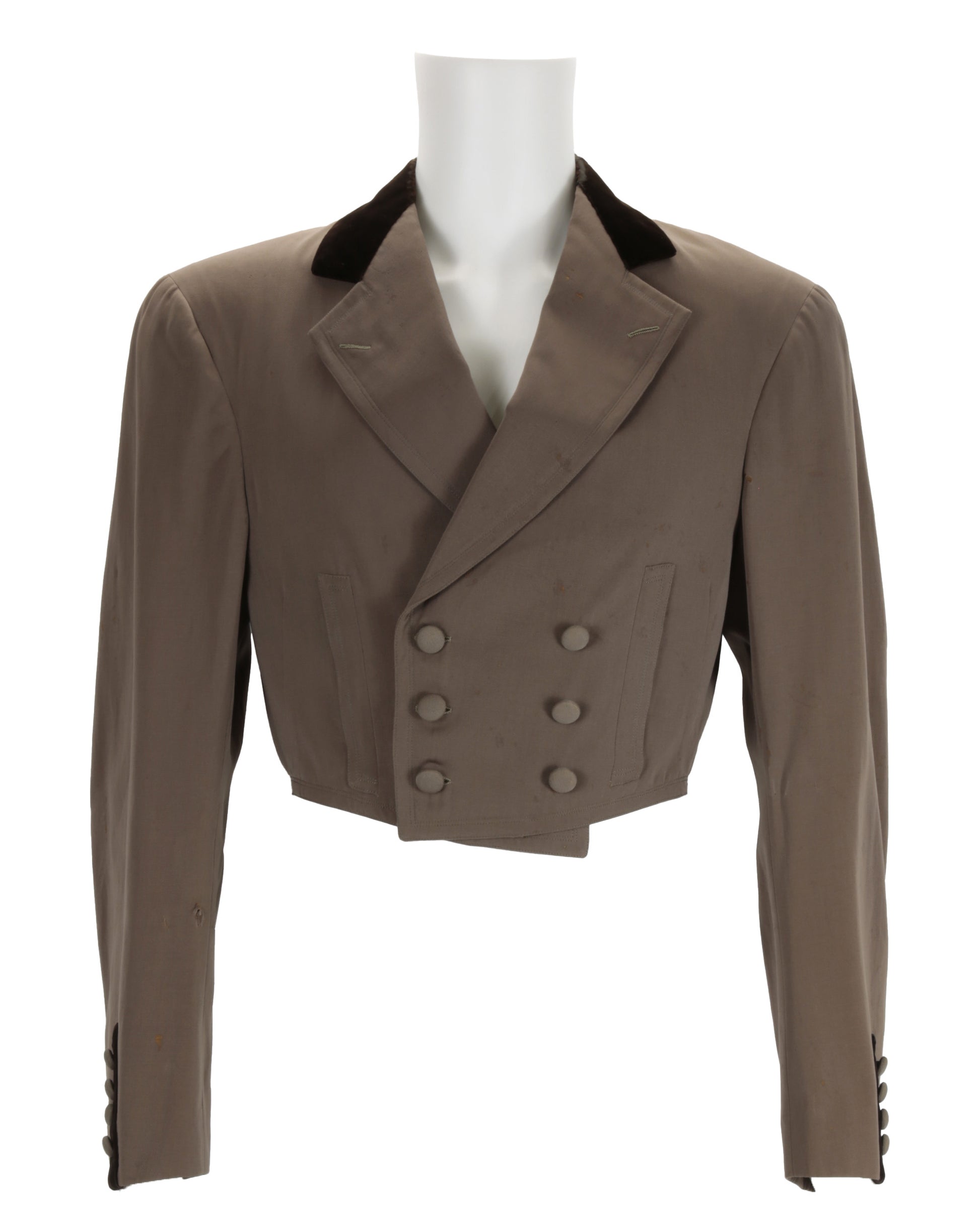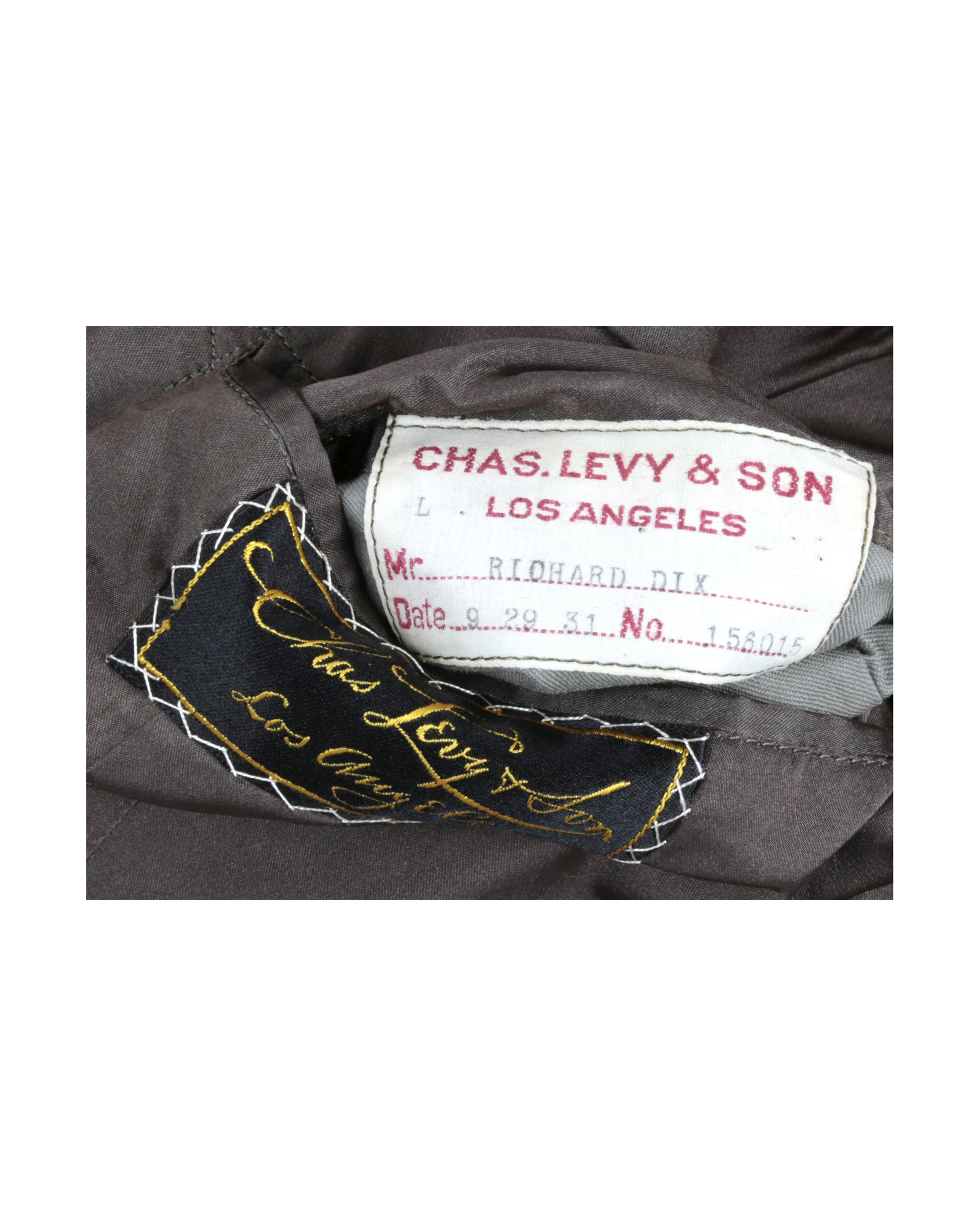 Own a piece of Hollywood history with this exceptional Western costume attributed to legendary actor Richard Dix. This rare ensemble features a meticulously tailored brown gabardine jacket and matching pants, custom-made for Dix in 1931 by the renowned Los Angeles costume house Chas. Levy & Son. The jacket showcases a double-breasted button closure on the front, with rich brown velvet accents lining the collar and sleeve buttons. Two functional pockets adorn the obverse, and the interior is lined with luxurious brown silk, including an interior pocket on the proper right side. Original tags remain intact, including an exterior tag reading “Chas Levy & Son / Los Angeles” and an interior tag handwritten and stamped with “CHAS.LEVY & SON / LOS ANGELES / Mr. RICHARD DIX / Date 9 29 31 No 156015.”