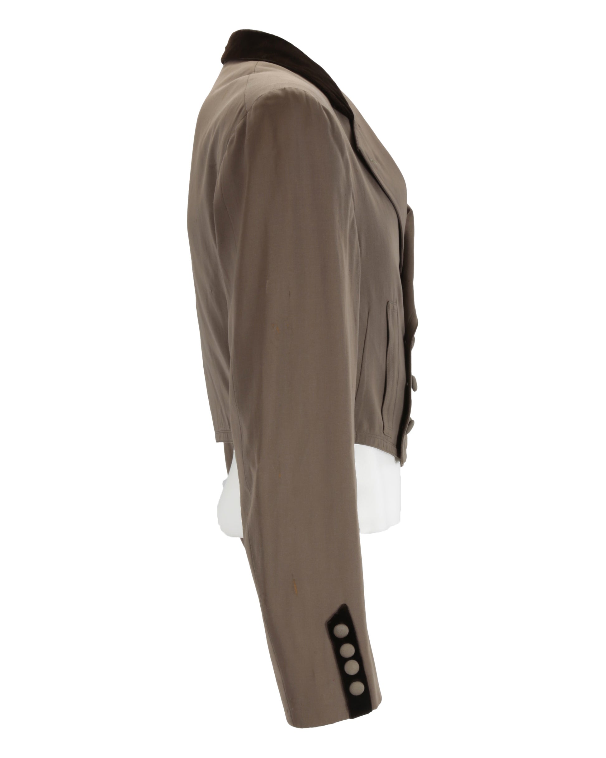 The jacket shows small areas of wear throughout, with slight wear at the top of the collar, minor pinholes throughout the interior, and small tears in the lining at the proper left armpit. The pants exhibit small areas of wear throughout as well, along with minor pinholes.