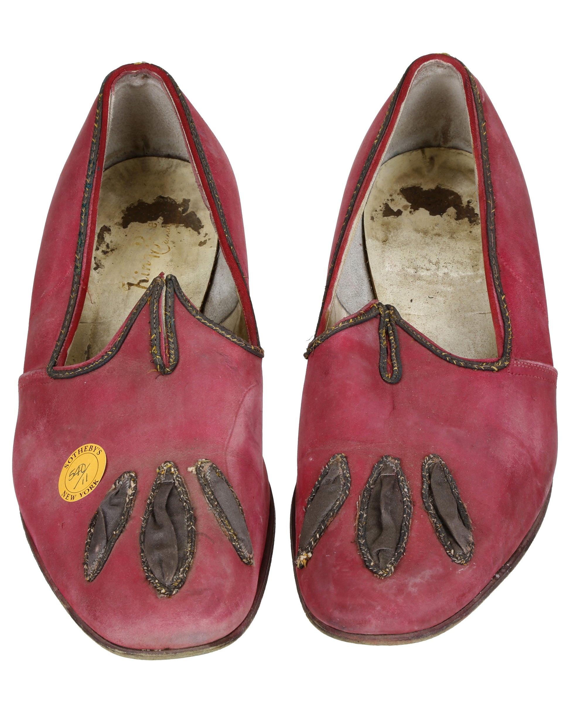 Step into cinematic history with this pair of men’s rose-colored period-style leather slipper shoes, believed to be screen-used in the production of Young Bess (1953). These elegant and historically styled slippers feature: a pointed throat with a central split; brown piping tracing the opening and throat; three oblong brown cloth accents sewn onto each vamp; and a soft rose-colored leather finish. The right shoe includes a partially legible insole inscription, reading: "King Bee / Casual", and bears an original round orange Sotheby’s sticker marked: "SOTHEBY’S / 540/11 / NEW YORK". The left shoe features similar construction, with the insole inscription fully worn.