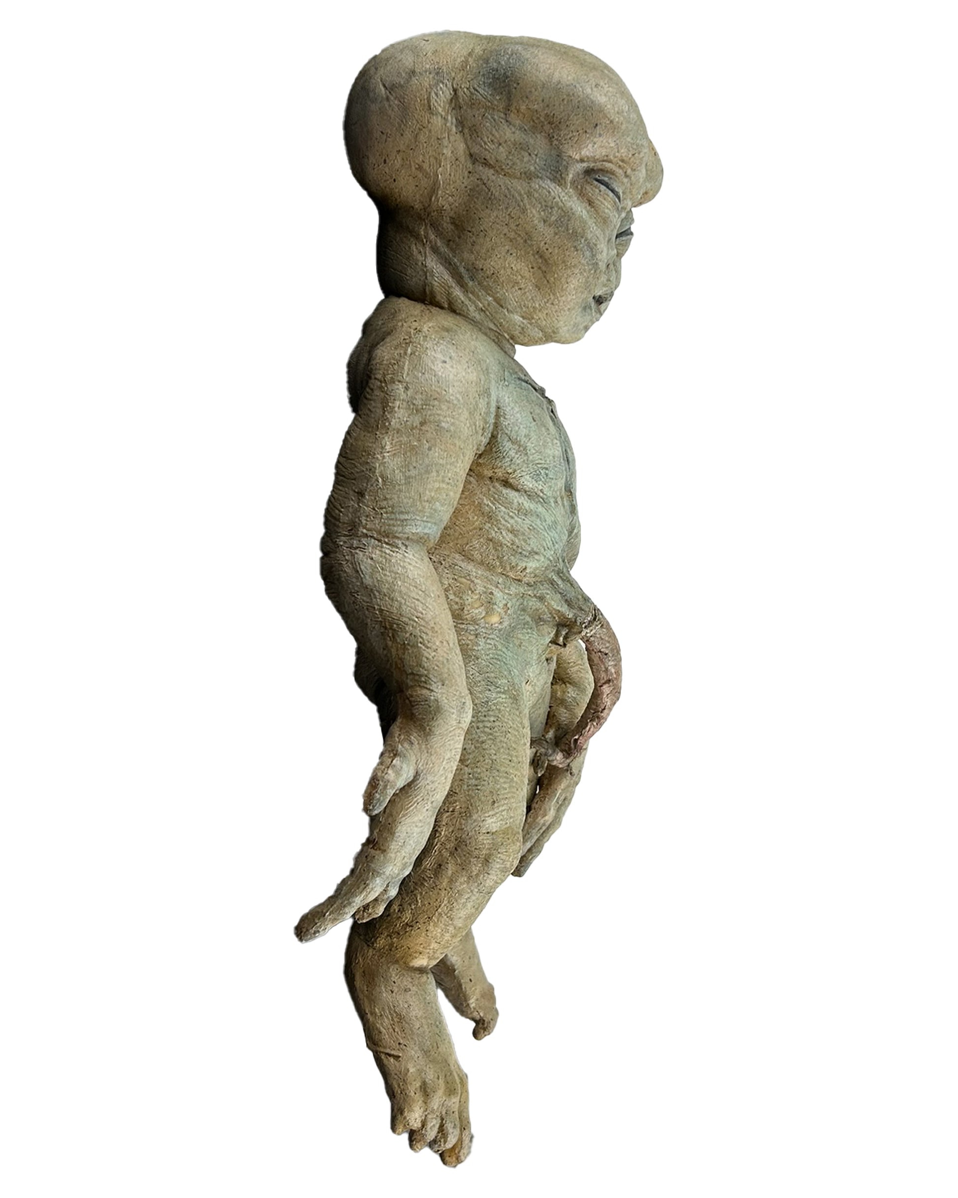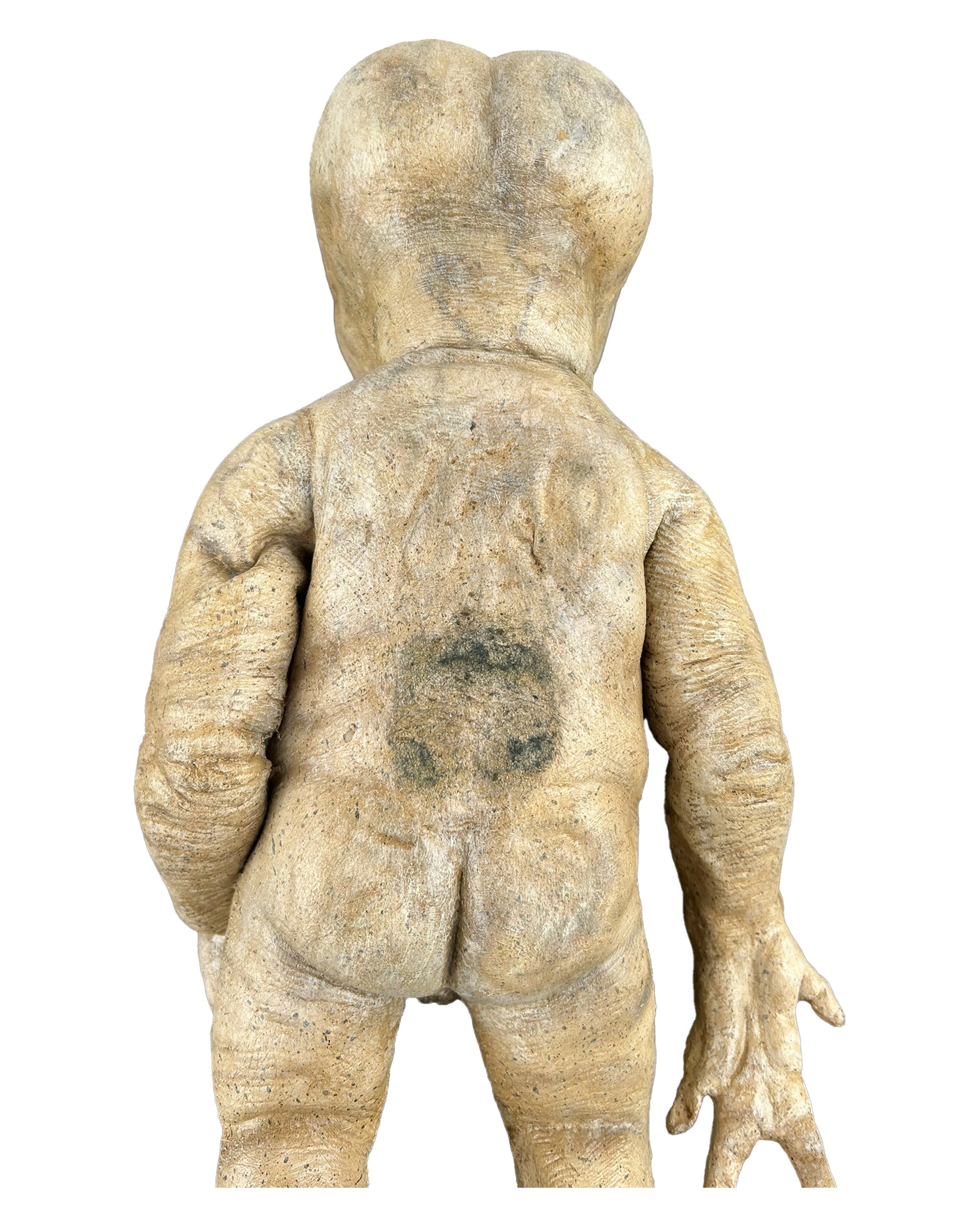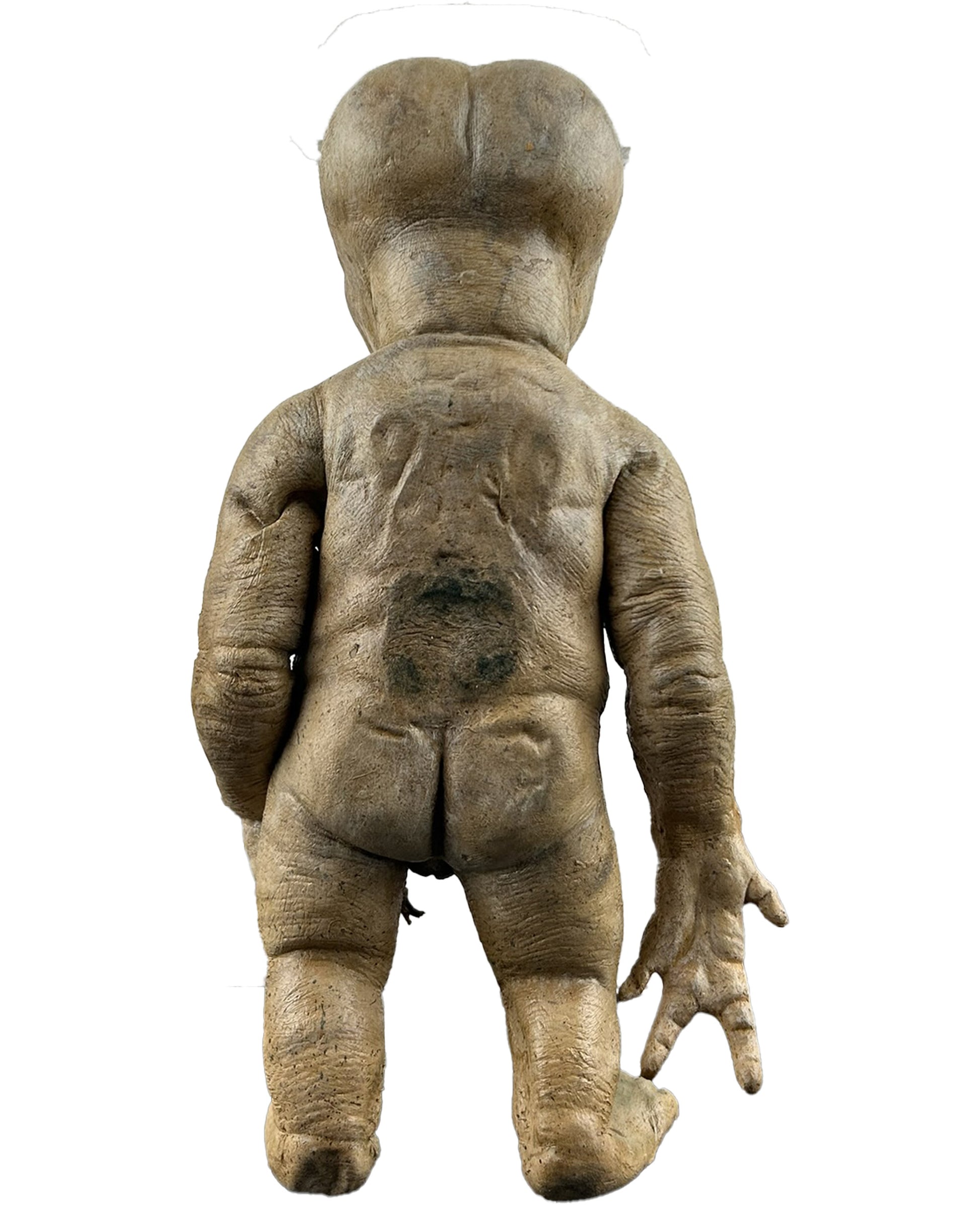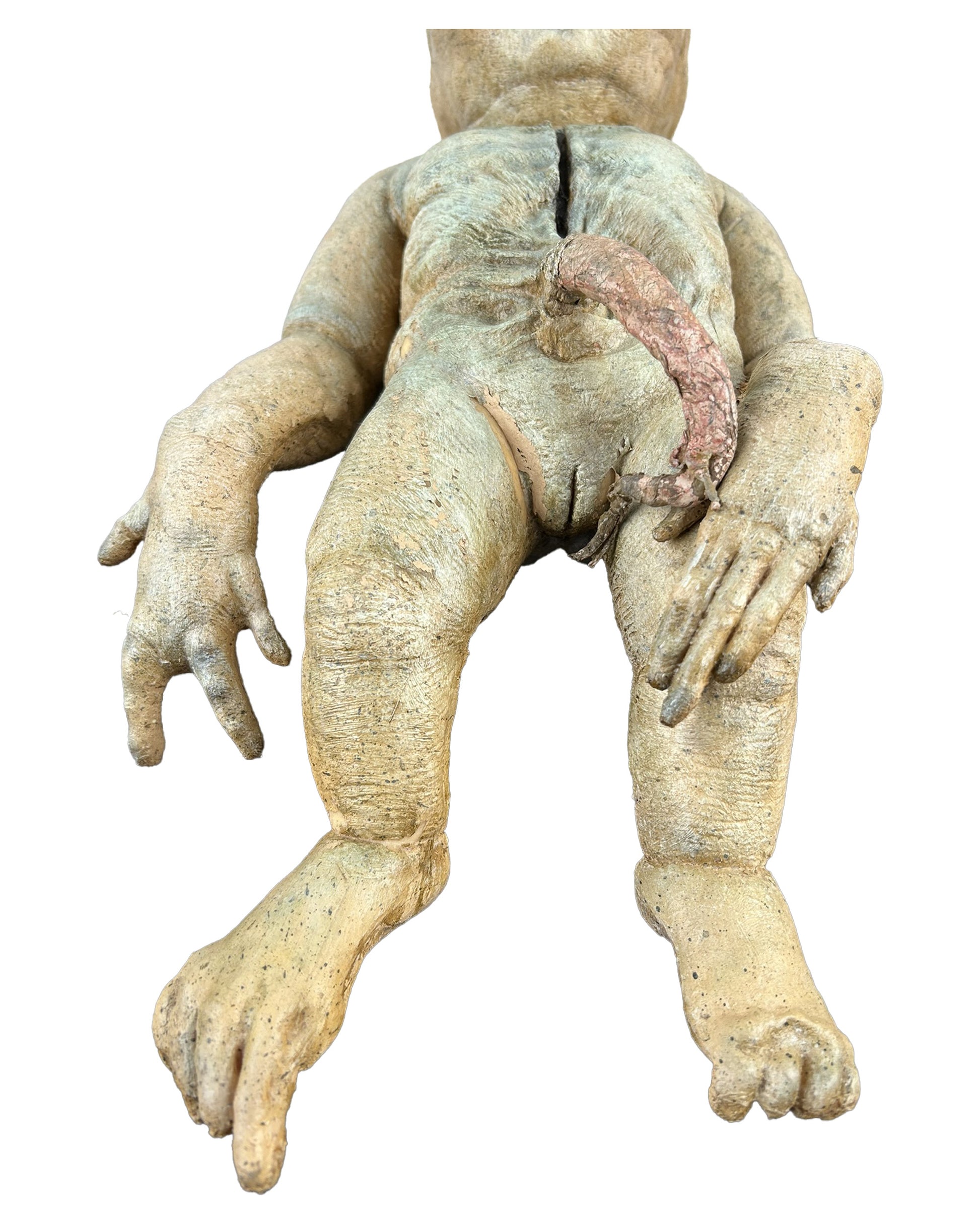 Offered here is a distinctive foam test tube baby prop from Village of the Damned (1995), finished in a grayish-peach coloration and designed with unsettling anatomical detail consistent with the film’s eerie aesthetic. The female infant figure features a noticeably misshapen head, four fingers on each hand, and four toes on each foot, emphasizing the unnatural origins depicted in the story. An attached umbilical cord remains present, and the torso displays a prominent T-shaped incision across the chest, a detail commonly associated with autopsy examination and laboratory experimentation. The sculpt includes exaggerated lower body modeling, further contributing to the unsettling realism of the piece.