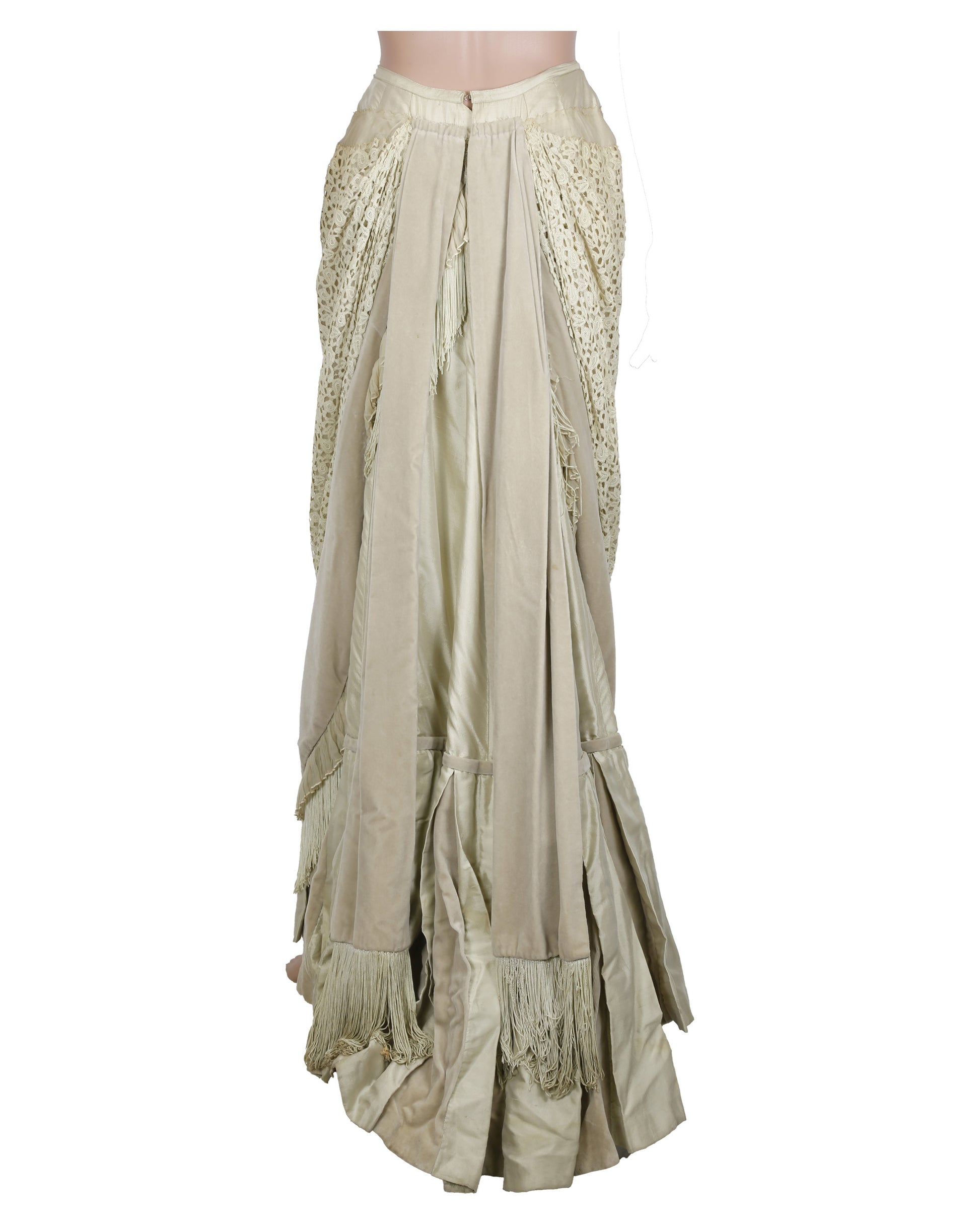 The skirt is in overall good condition with minor discoloration to the front fringe, staining and discoloration to the lower pleats, and some looseness in the velvet trim attached to the lace overlay.